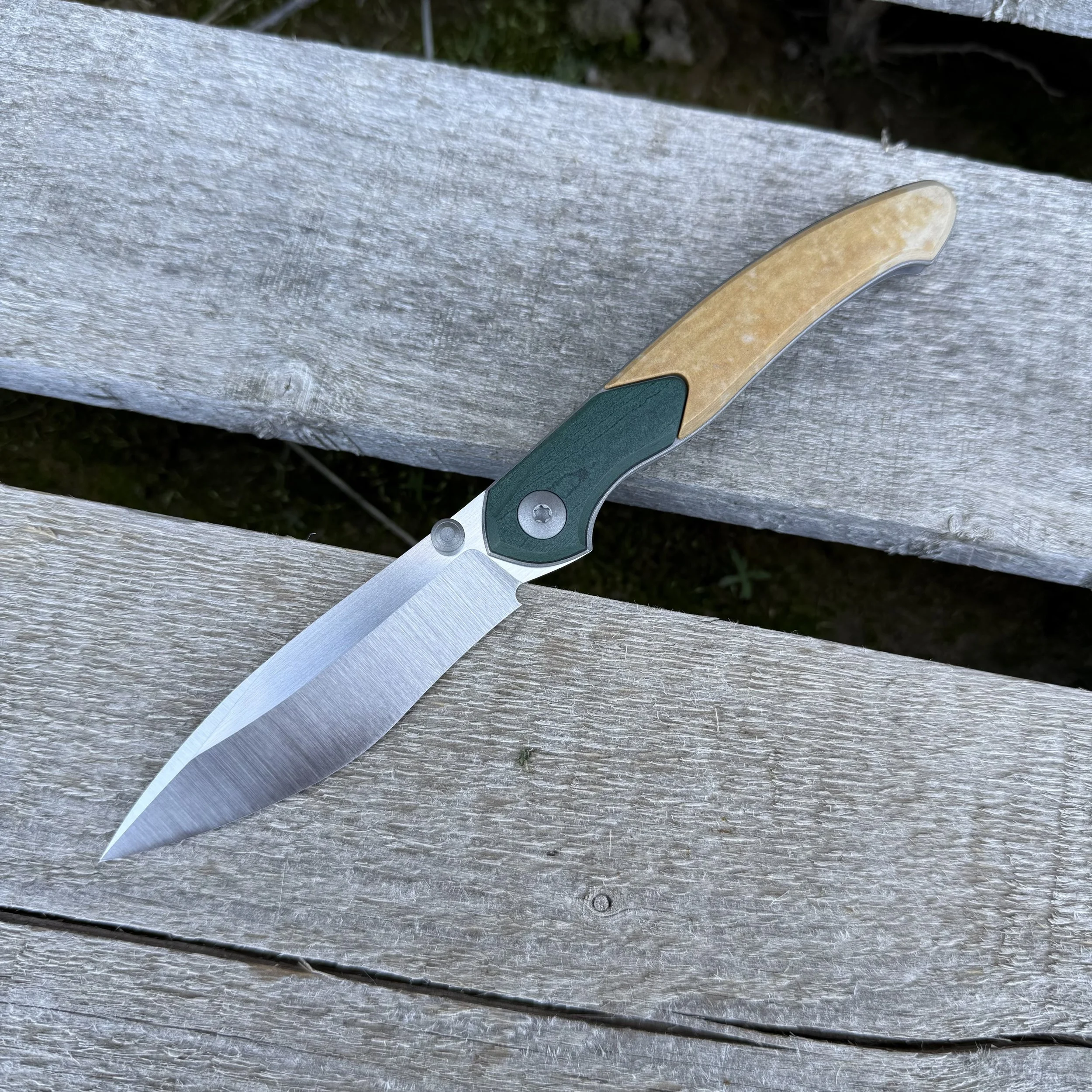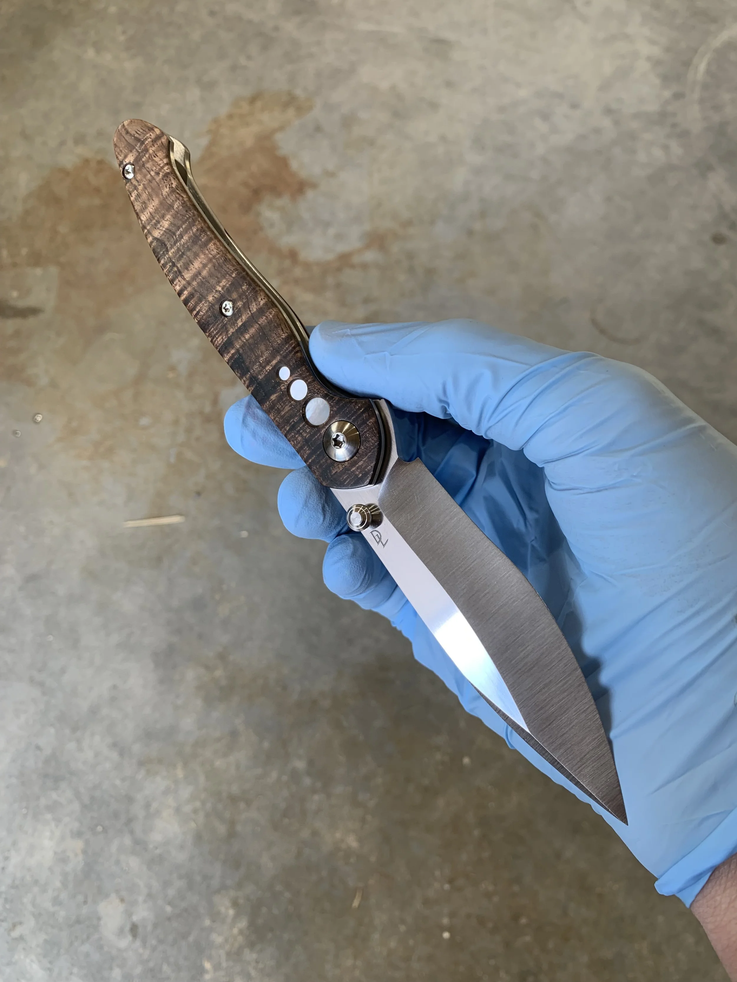 Person holding a folding knife with a wood handle and a shiny blade, wearing a blue glove.