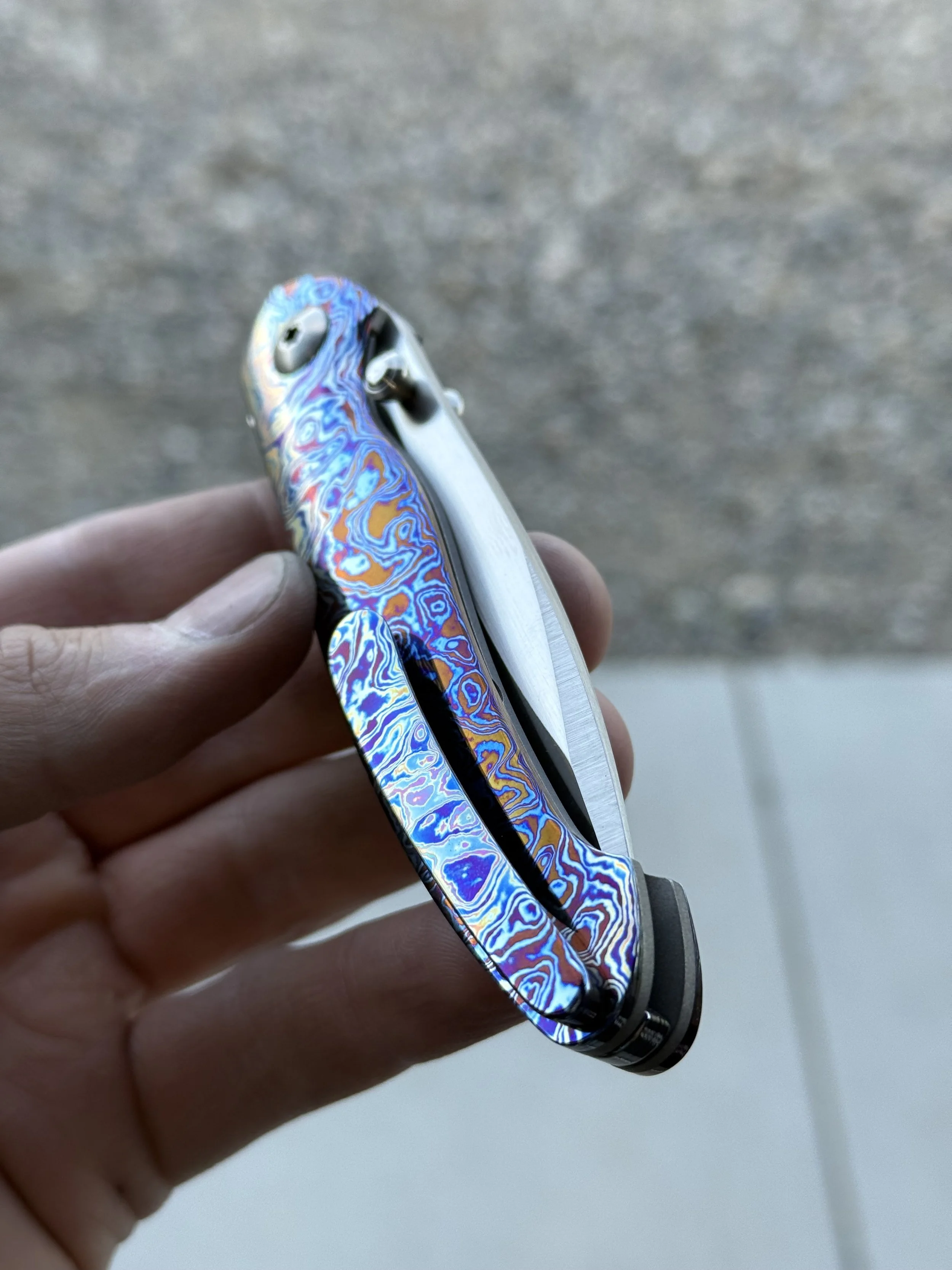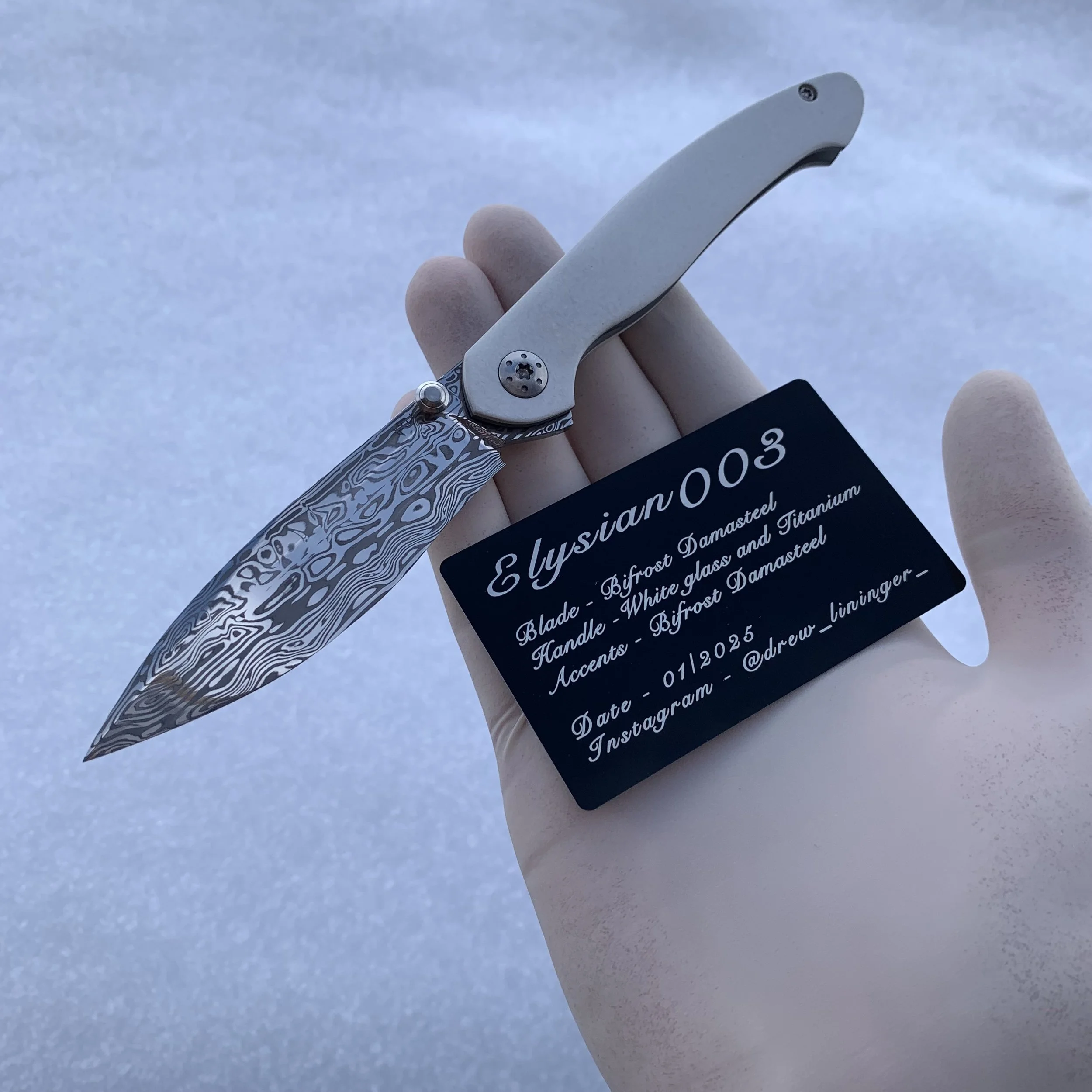A hand holding an intricate Damascus steel folding knife with a decorative blade and a plain handle. Accompanied by a card labeled 'Elysian 003' detailing materials and designer information.