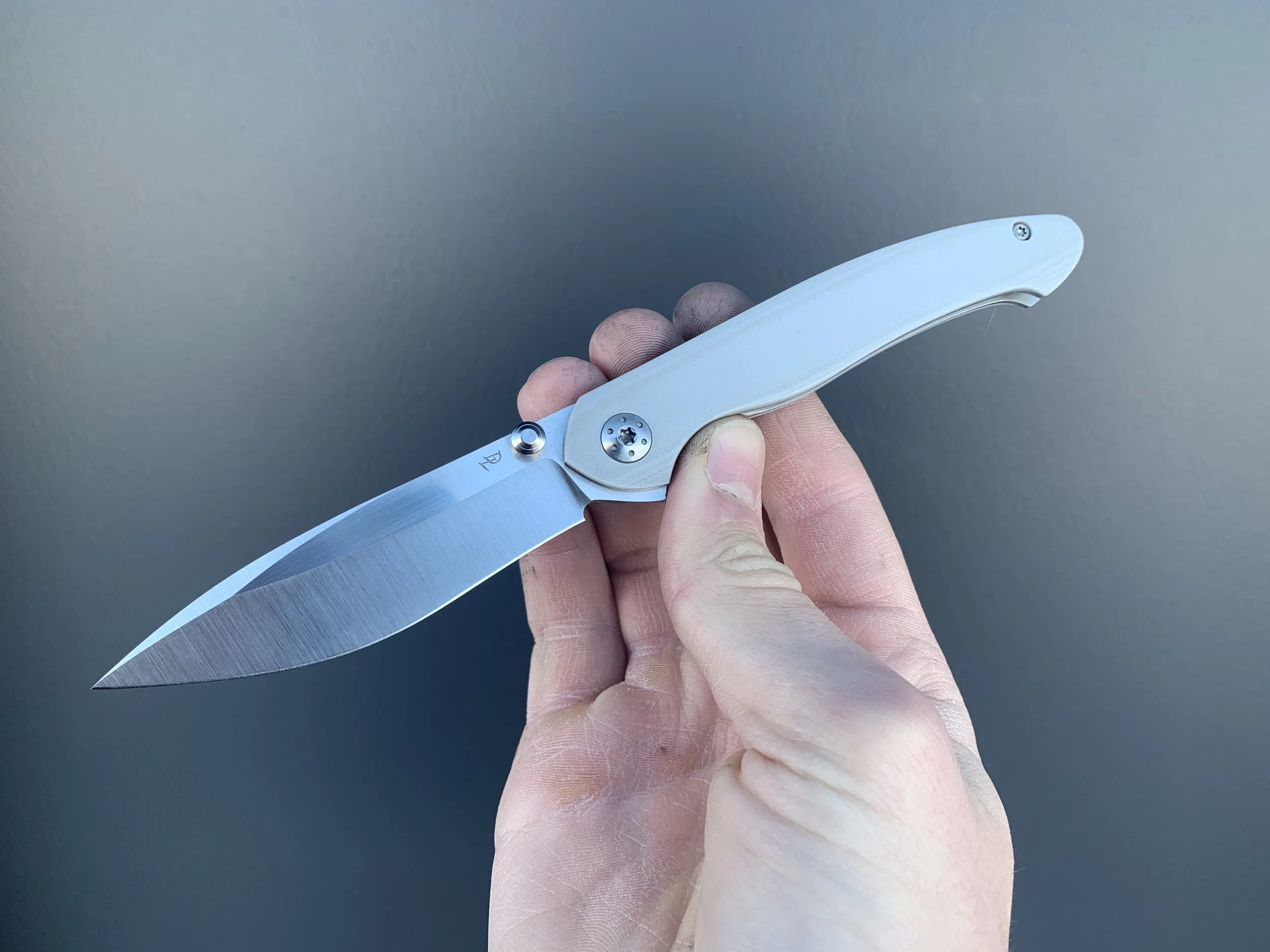 A person holding a folding pocket knife with a silver blade and handle against a plain background.
