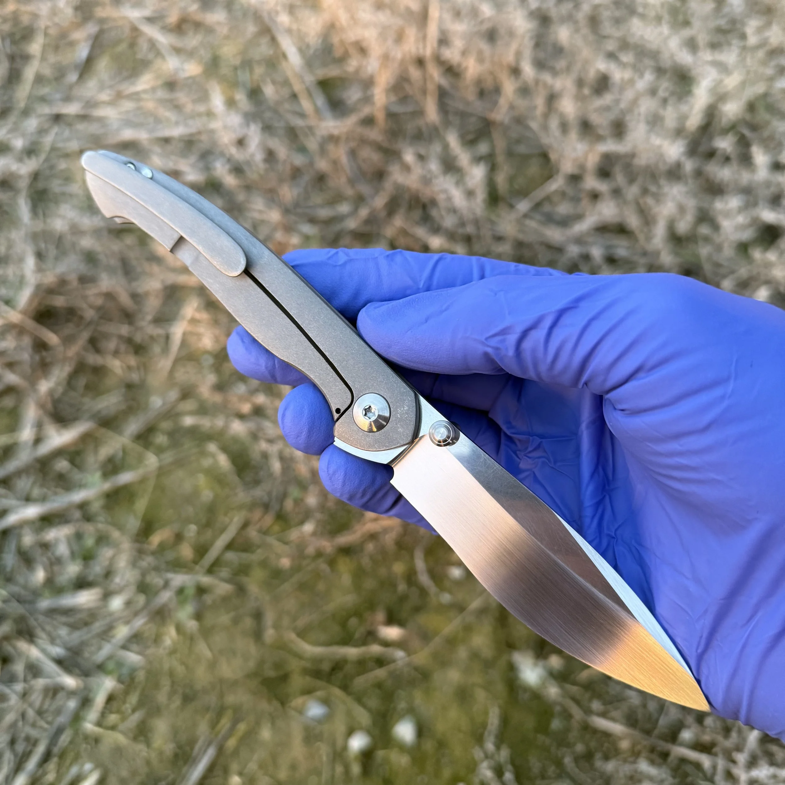 Person wearing blue gloves holding a folding knife outdoors on a grassy background.